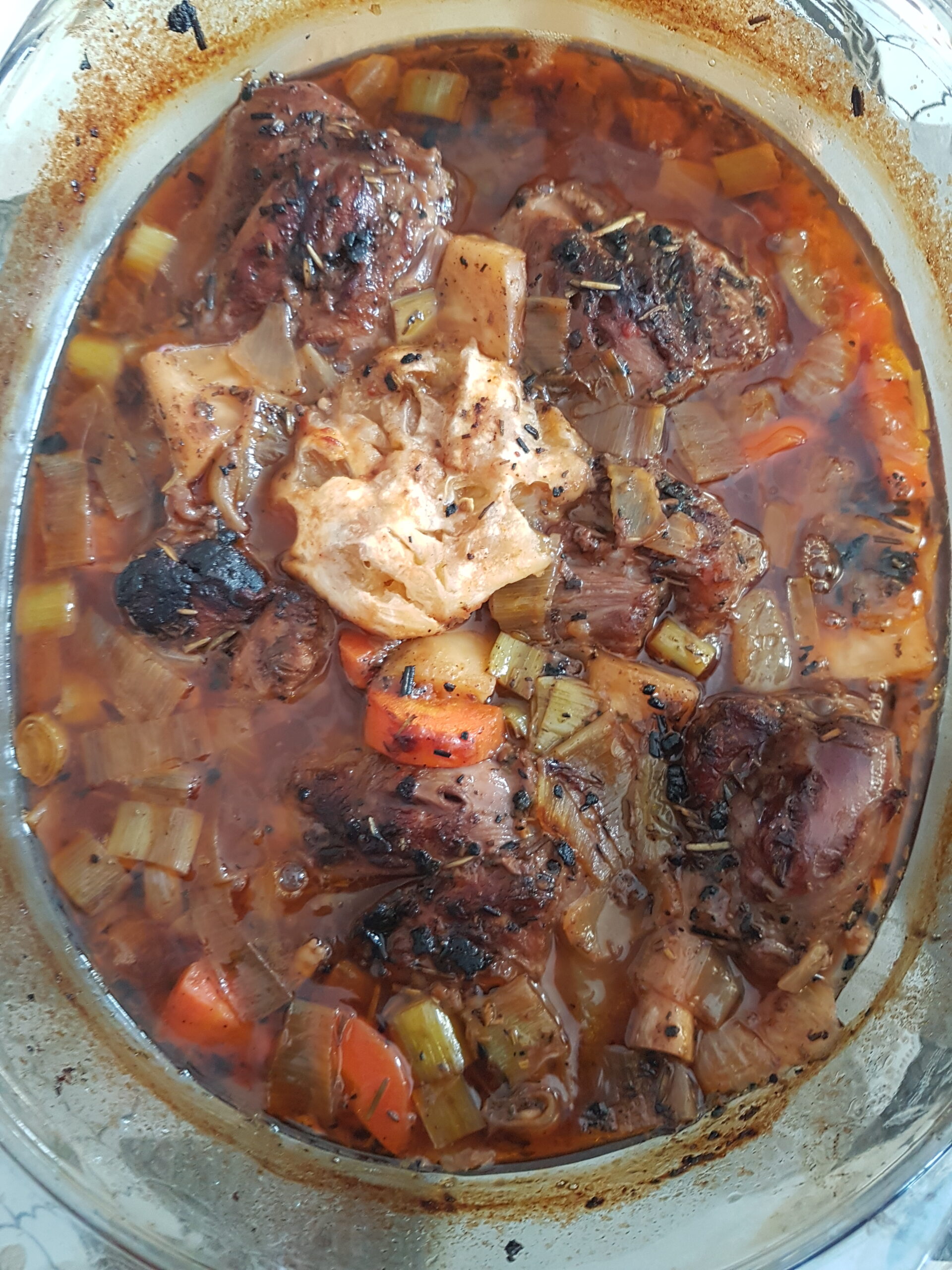 Fleisch wieder dazugeben und alles rundum anbraten, mit (viel) Porto ablöschen. Boullion zugeben und bei 180°C zugedeckt /2h köcheln.