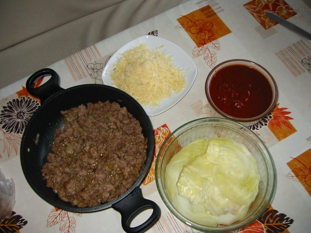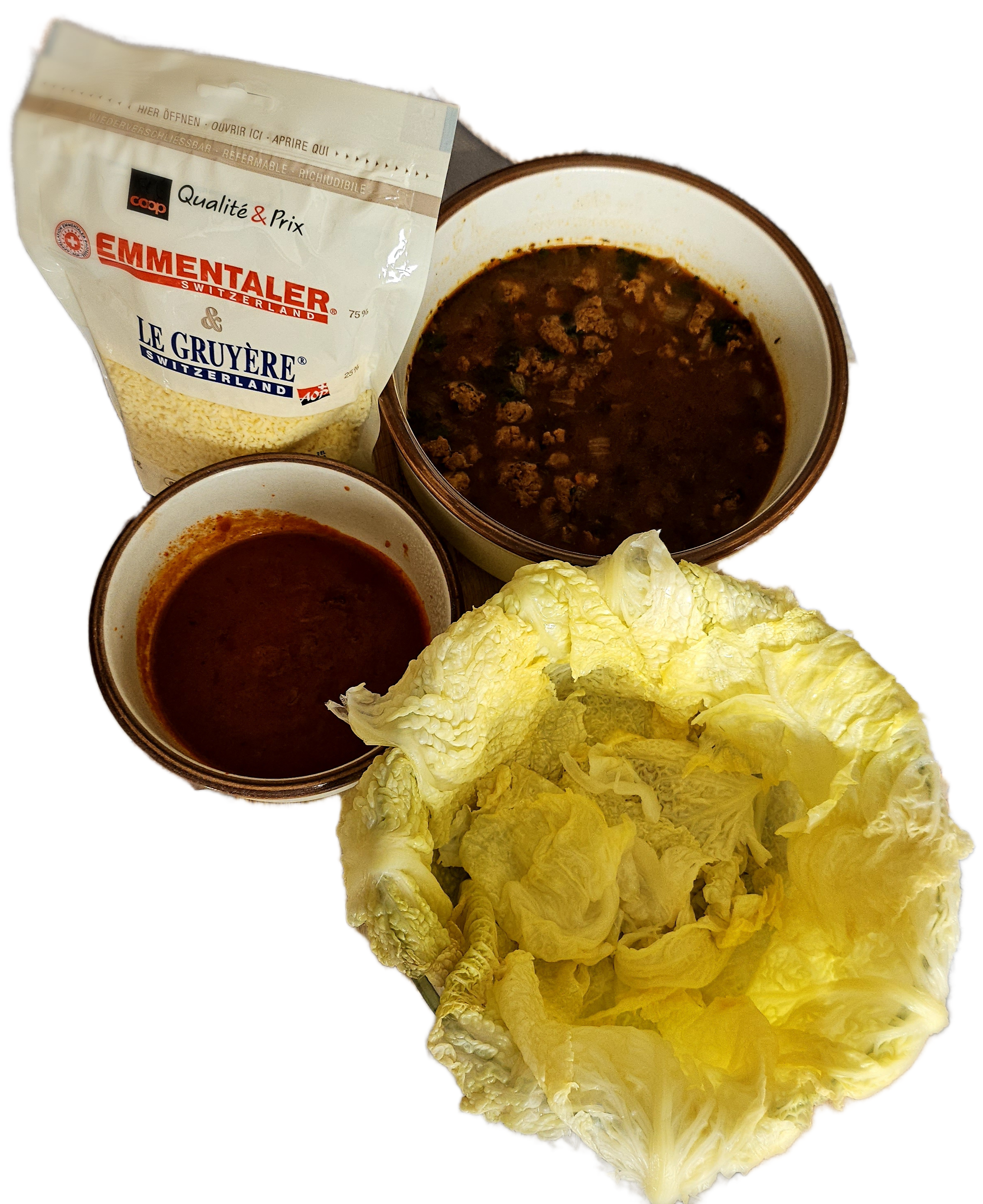 - Glasschale schichtweise belegen: Gehacktes, Tomatensauce, Käse, Kohlblätter und…wieder von Vorne…..