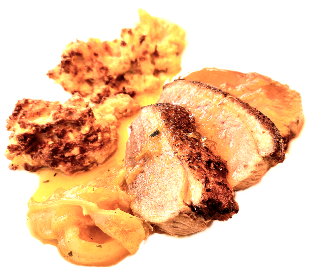 - In einen kleinen Bräter den Saft von 2 Orangen und 1/8 Liter Wasser geben. Die Entenbrust mit der Fettseite nach oben hineingeben. Im vorgeheizten Backofen bei 225° etwa 15-20 min. geschlossen garen. Eventuell noch 5 min. ohne Deckel, damit die Fettseite schön kross wird. Die Entenbrust sollte innen noch zartrosa sein.
