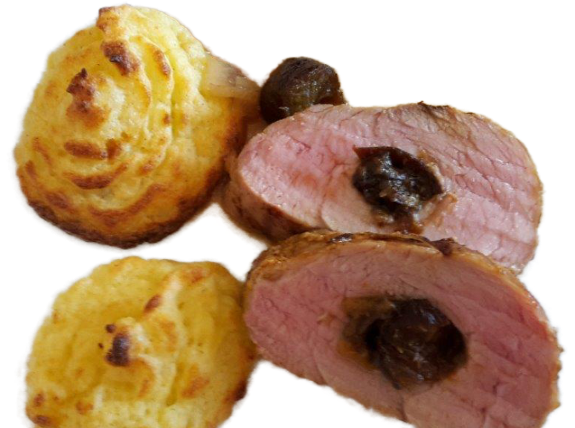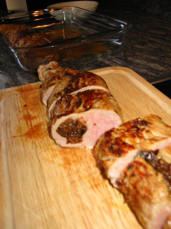 - Filet mit den Zwetschgen füllen. Mit einem Holzlöffel „vorlochen“ und dann geviertelte